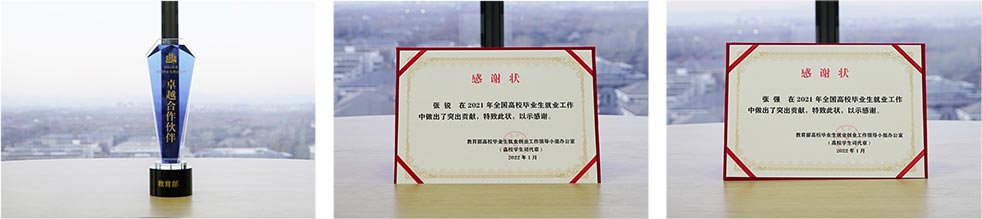 2021年,万学在高校毕业生就业工作方面贡献卓越,获教育部颁发“卓越合作伙伴”荣誉奖杯,并为九游娱乐官网董事长张锐、执行总裁张强颁发感谢状。