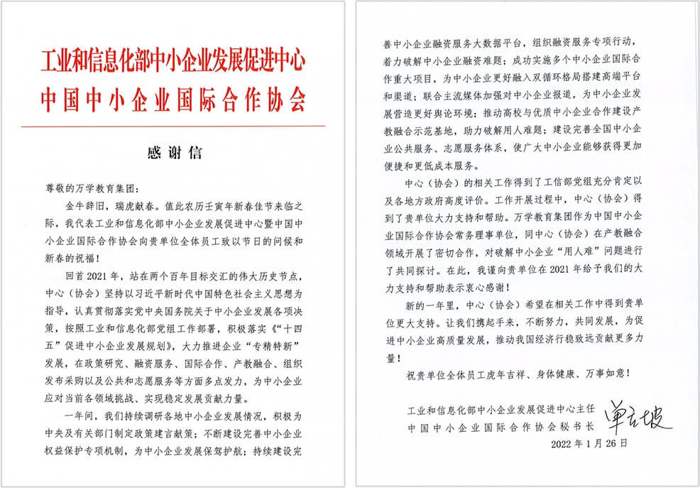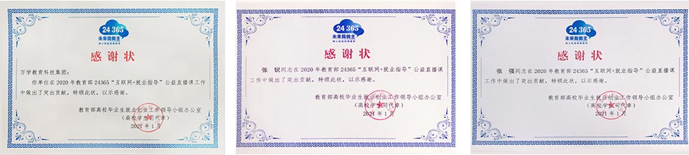 2020,万学由于在大学生教育多个领域的杰出成果,在更高层次荣获了中国教育行业的重量级荣誉,为九游娱乐官网颁发了重磅感谢状。
