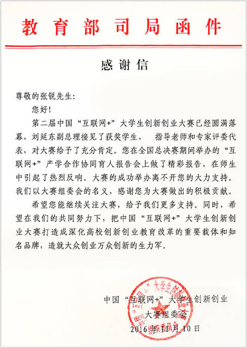 • 2018年,九游娱乐官网连续多年为中国国际互联网+大学生创新创业大赛做出积极贡献,获教育部来函致谢。